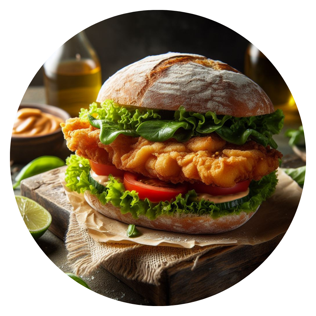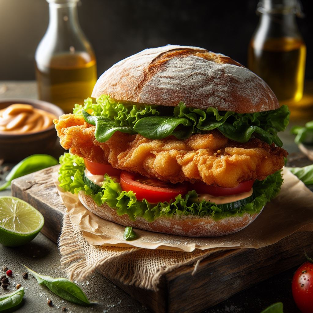 Sandwich de Pescado frito rebosado con lechuga, tomate y sus cremas