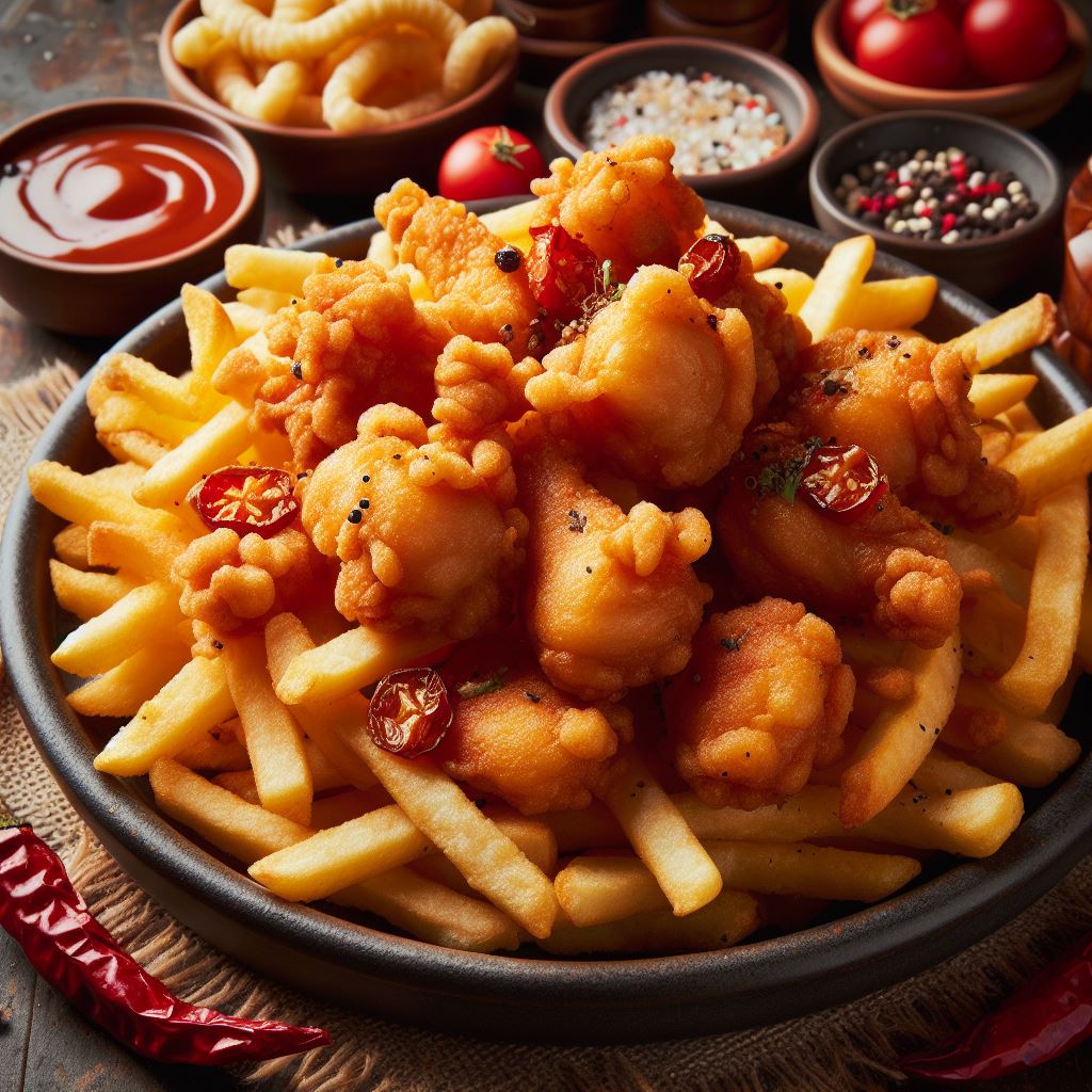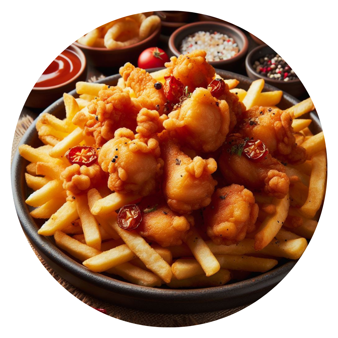 Trozitos de chicharron de Pollo con papas fritas con 2 cremas a eleccion para 1 persona